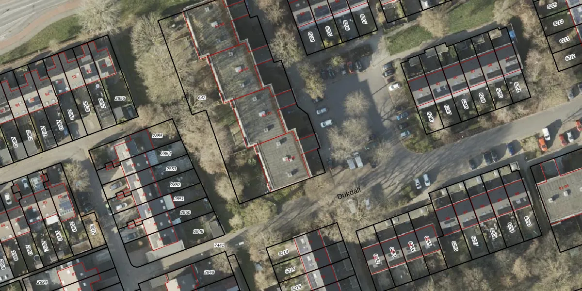 Het perceel waarop Dukdalf 71 staat heeft een oppervlakte van 2201 m². Dit is een zeer groot perceel. De perceeloppervlakte wordt geregistreerd door het Kadaster. Gedetailleerde informatie over de maten van dit perceel kunt u vinden in het rapport Kadastrale kaart met maatvoering van Dukdalf 71.