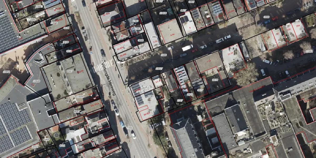 Het perceel waarop Emmastraat 1-2 staat heeft een oppervlakte van 57 m². Dit is een klein perceel. De perceeloppervlakte wordt geregistreerd door het Kadaster. Gedetailleerde informatie over de maten van dit perceel kunt u vinden in het rapport Kadastrale kaart met maatvoering van Emmastraat 1-2.