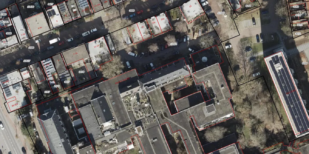 Het perceel waarop Emmastraat 15-f-102 staat heeft een oppervlakte van 2,0 ha. Dit is een zeer groot perceel. De perceeloppervlakte wordt geregistreerd door het Kadaster. Gedetailleerde informatie over de maten van dit perceel kunt u vinden in het rapport Kadastrale kaart met maatvoering van Emmastraat 15-f-102.
