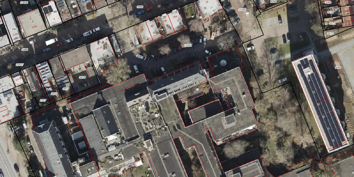 Het perceel waarop Emmastraat 15-f-109 staat heeft een oppervlakte van 2,0 ha. Dit is een zeer groot perceel. De perceeloppervlakte wordt geregistreerd door het Kadaster. Gedetailleerde informatie over de maten van dit perceel kunt u vinden in het rapport Kadastrale kaart met maatvoering van Emmastraat 15-f-109.