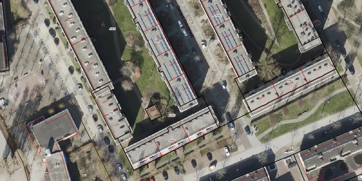 Gerard Doustraat 10 is gelegen op kadastraal perceel GNG00L4965. Deze kadastrale aanduiding is uniek en wordt gebruikt door het Kadaster om eigendomsrechten en andere zakelijke rechten vast te leggen. Het perceel maakt onderdeel uit van de kadastrale gemeente Groningen.