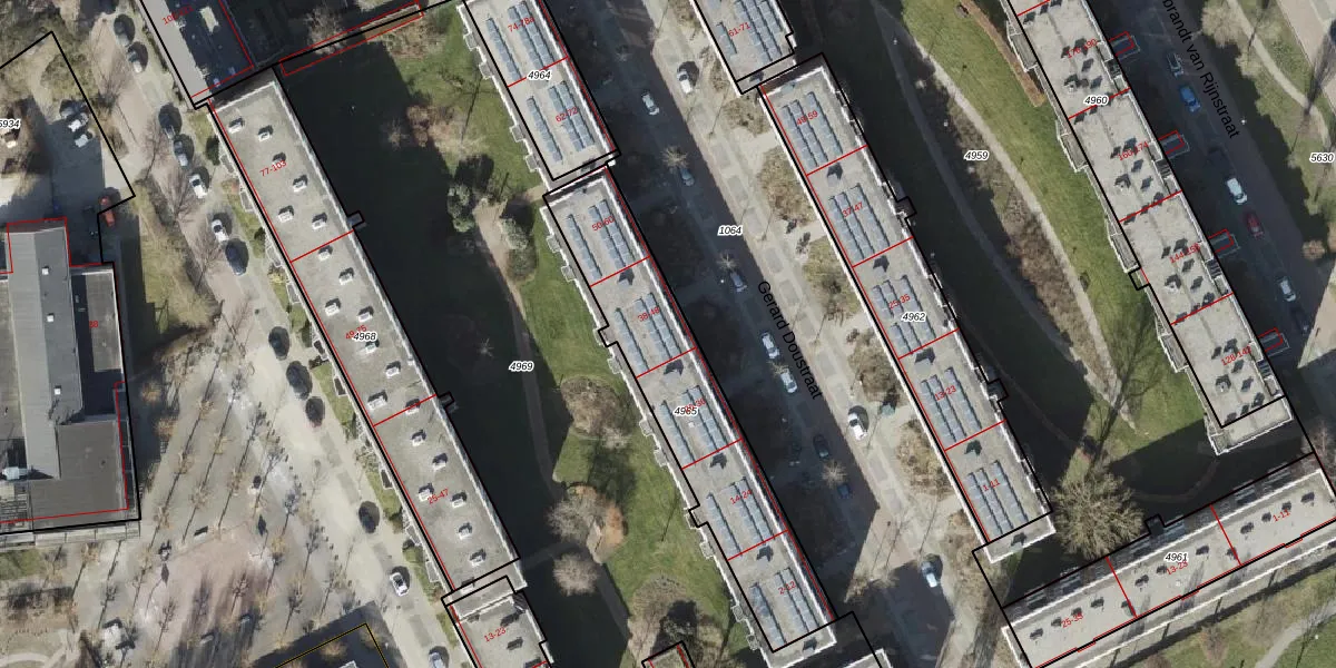 Het perceel waarop Gerard Doustraat 42 staat heeft een oppervlakte van 837 m². Dit is een groot perceel. De perceeloppervlakte wordt geregistreerd door het Kadaster. Gedetailleerde informatie over de maten van dit perceel kunt u vinden in het rapport Kadastrale kaart met maatvoering van Gerard Doustraat 42.