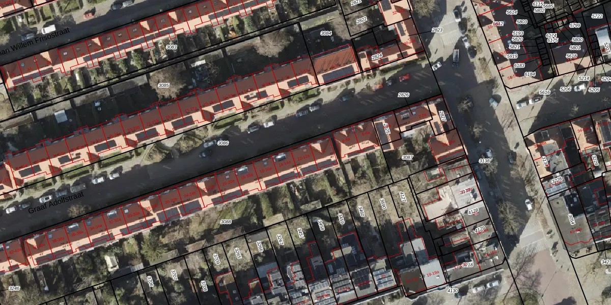 Het perceel waarop Graaf Adolfstraat 12-a staat heeft een oppervlakte van 3105 m². Dit is een zeer groot perceel. De perceeloppervlakte wordt geregistreerd door het Kadaster. Gedetailleerde informatie over de maten van dit perceel kunt u vinden in het rapport Kadastrale kaart met maatvoering van Graaf Adolfstraat 12-a.