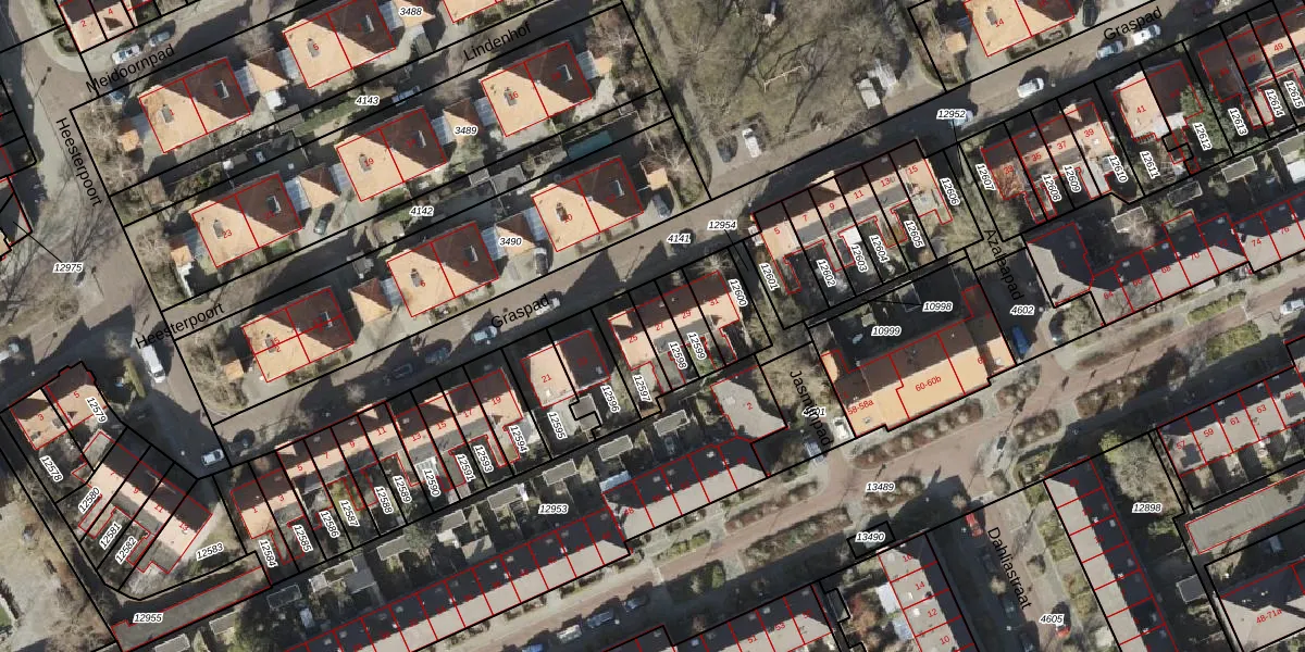Het perceel waarop Graspad 27 staat heeft een oppervlakte van 76 m². Dit is een klein perceel. De perceeloppervlakte wordt geregistreerd door het Kadaster. Gedetailleerde informatie over de maten van dit perceel kunt u vinden in het rapport Kadastrale kaart met maatvoering van Graspad 27.