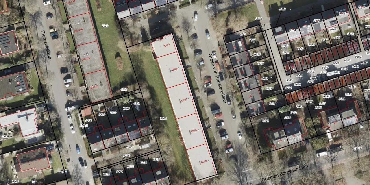 Het perceel waarop Groen van Prinstererlaan 57 staat heeft een oppervlakte van 2080 m². Dit is een zeer groot perceel. De perceeloppervlakte wordt geregistreerd door het Kadaster. Gedetailleerde informatie over de maten van dit perceel kunt u vinden in het rapport Kadastrale kaart met maatvoering van Groen van Prinstererlaan 57.