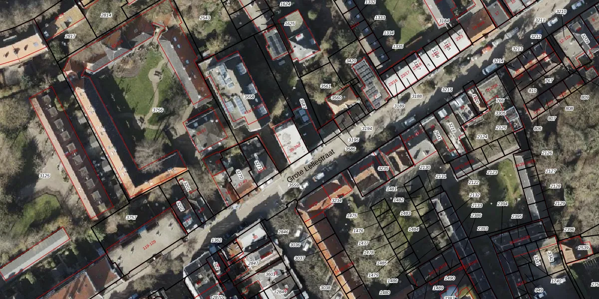 Het perceel waarop Grote Leliestraat 39-a staat heeft een oppervlakte van 825 m². Dit is een groot perceel. De perceeloppervlakte wordt geregistreerd door het Kadaster. Gedetailleerde informatie over de maten van dit perceel kunt u vinden in het rapport Kadastrale kaart met maatvoering van Grote Leliestraat 39-a.