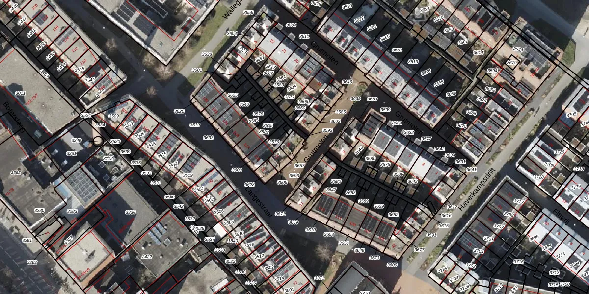 Het perceel waarop Grutmolen 14 staat heeft een oppervlakte van 47 m². Dit is een klein perceel. De perceeloppervlakte wordt geregistreerd door het Kadaster. Gedetailleerde informatie over de maten van dit perceel kunt u vinden in het rapport Kadastrale kaart met maatvoering van Grutmolen 14.