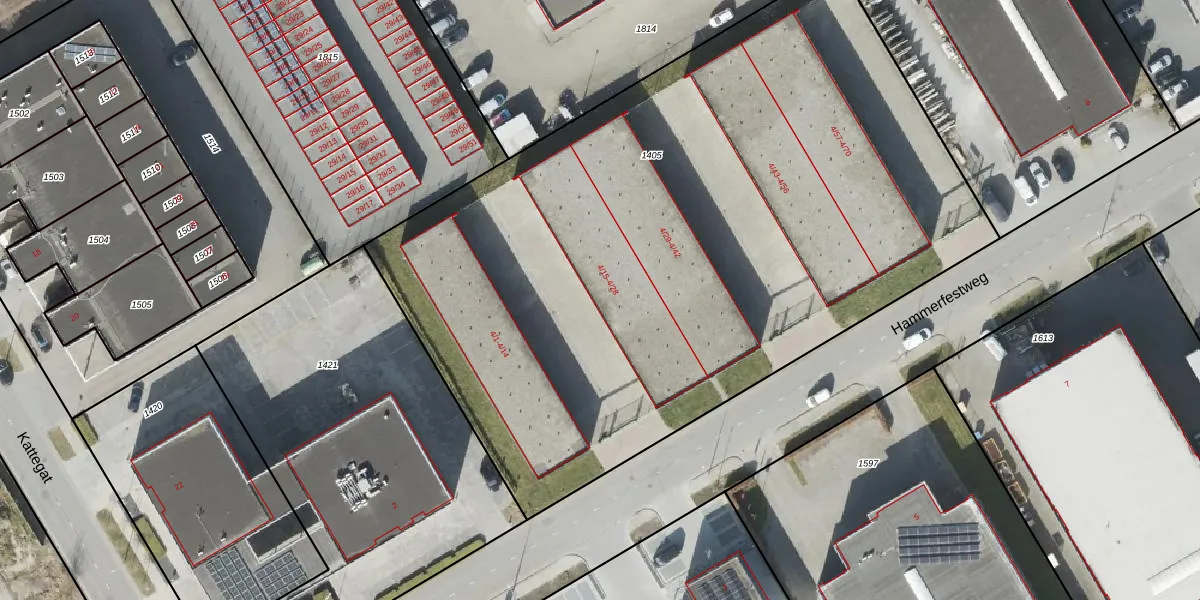 Het perceel waarop Hammerfestweg 4-16 staat heeft een oppervlakte van 4887 m². Dit is een zeer groot perceel. De perceeloppervlakte wordt geregistreerd door het Kadaster. Gedetailleerde informatie over de maten van dit perceel kunt u vinden in het rapport Kadastrale kaart met maatvoering van Hammerfestweg 4-16.