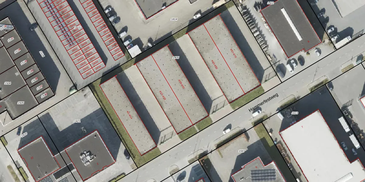 Het perceel waarop Hammerfestweg 4-38 staat heeft een oppervlakte van 4887 m². Dit is een zeer groot perceel. De perceeloppervlakte wordt geregistreerd door het Kadaster. Gedetailleerde informatie over de maten van dit perceel kunt u vinden in het rapport Kadastrale kaart met maatvoering van Hammerfestweg 4-38.
