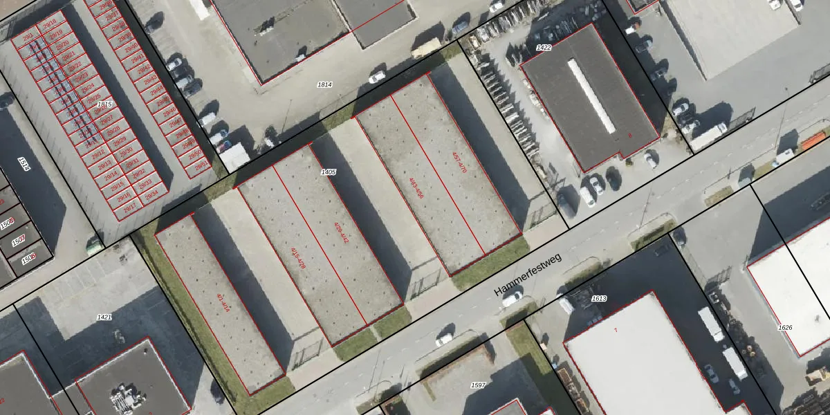 Het perceel waarop Hammerfestweg 4-45 staat heeft een oppervlakte van 4887 m². Dit is een zeer groot perceel. De perceeloppervlakte wordt geregistreerd door het Kadaster. Gedetailleerde informatie over de maten van dit perceel kunt u vinden in het rapport Kadastrale kaart met maatvoering van Hammerfestweg 4-45.