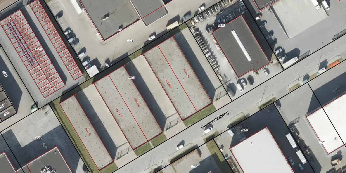 Het perceel waarop Hammerfestweg 4-51 staat heeft een oppervlakte van 4887 m². Dit is een zeer groot perceel. De perceeloppervlakte wordt geregistreerd door het Kadaster. Gedetailleerde informatie over de maten van dit perceel kunt u vinden in het rapport Kadastrale kaart met maatvoering van Hammerfestweg 4-51.