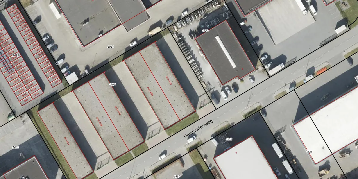 Het perceel waarop Hammerfestweg 4-61 staat heeft een oppervlakte van 4887 m². Dit is een zeer groot perceel. De perceeloppervlakte wordt geregistreerd door het Kadaster. Gedetailleerde informatie over de maten van dit perceel kunt u vinden in het rapport Kadastrale kaart met maatvoering van Hammerfestweg 4-61.
