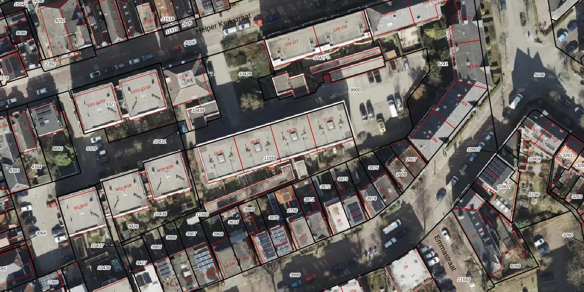 Helper Kerkstraat 75 is gelegen op kadastraal perceel HMN02M11559. Deze kadastrale aanduiding is uniek en wordt gebruikt door het Kadaster om eigendomsrechten en andere zakelijke rechten vast te leggen. Het perceel maakt onderdeel uit van de kadastrale gemeente Helpman.