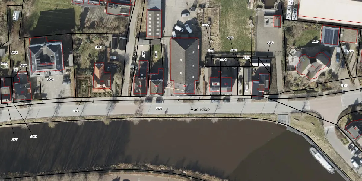 Het perceel waarop Hoendiep 182 staat heeft een oppervlakte van 6834 m². Dit is een zeer groot perceel. De perceeloppervlakte wordt geregistreerd door het Kadaster. Gedetailleerde informatie over de maten van dit perceel kunt u vinden in het rapport Kadastrale kaart met maatvoering van Hoendiep 182.