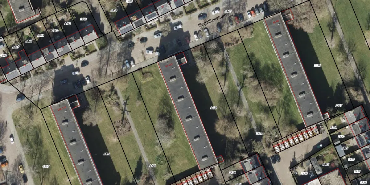 Het perceel waarop Illegaliteitslaan 132 staat heeft een oppervlakte van 2712 m². Dit is een zeer groot perceel. De perceeloppervlakte wordt geregistreerd door het Kadaster. Gedetailleerde informatie over de maten van dit perceel kunt u vinden in het rapport Kadastrale kaart met maatvoering van Illegaliteitslaan 132.