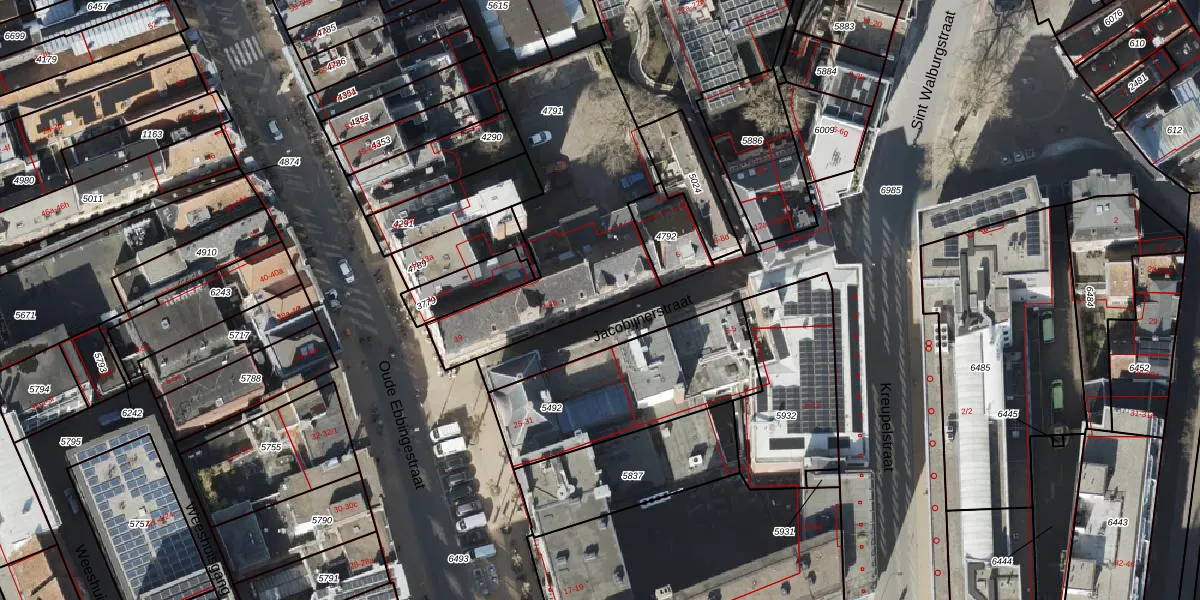 Het perceel waarop Jacobijnerstraat 2-a staat heeft een oppervlakte van 983 m². Dit is een groot perceel. De perceeloppervlakte wordt geregistreerd door het Kadaster. Gedetailleerde informatie over de maten van dit perceel kunt u vinden in het rapport Kadastrale kaart met maatvoering van Jacobijnerstraat 2-a.