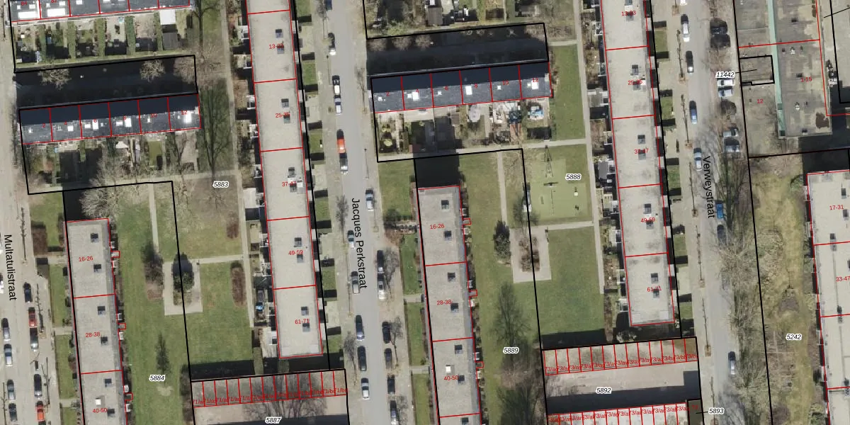 Het perceel waarop Jacques Perkstraat 16 staat heeft een oppervlakte van 2453 m². Dit is een zeer groot perceel. De perceeloppervlakte wordt geregistreerd door het Kadaster. Gedetailleerde informatie over de maten van dit perceel kunt u vinden in het rapport Kadastrale kaart met maatvoering van Jacques Perkstraat 16.