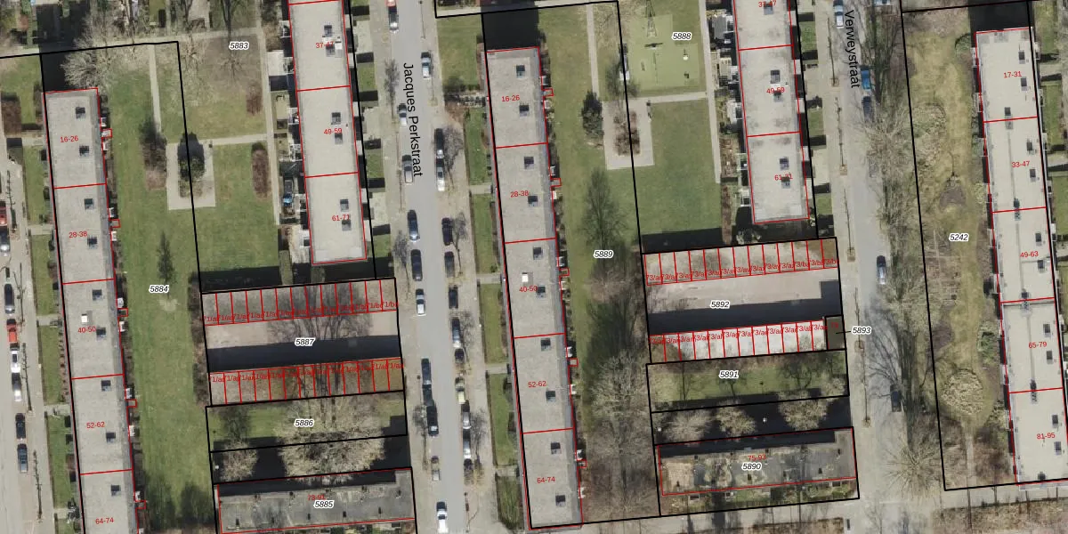 Het perceel waarop Jacques Perkstraat 46 staat heeft een oppervlakte van 2453 m². Dit is een zeer groot perceel. De perceeloppervlakte wordt geregistreerd door het Kadaster. Gedetailleerde informatie over de maten van dit perceel kunt u vinden in het rapport Kadastrale kaart met maatvoering van Jacques Perkstraat 46.