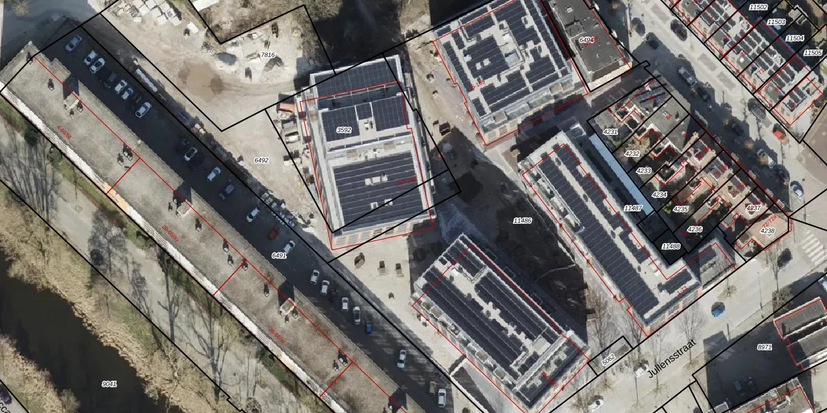 Het perceel waarop Jullensstraat 169 staat heeft een oppervlakte van 817 m². Dit is een groot perceel. De perceeloppervlakte wordt geregistreerd door het Kadaster. Gedetailleerde informatie over de maten van dit perceel kunt u vinden in het rapport Kadastrale kaart met maatvoering van Jullensstraat 169.