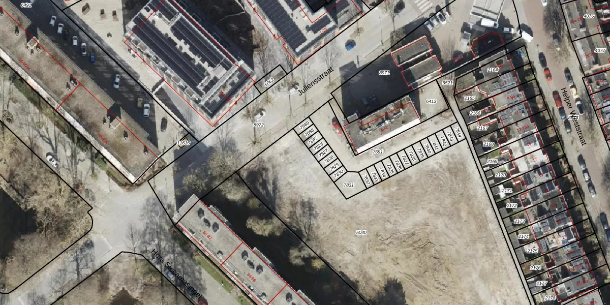 Het perceel waarop Jullensstraat 2-9 staat heeft een oppervlakte van 4170 m². Dit is een zeer groot perceel. De perceeloppervlakte wordt geregistreerd door het Kadaster. Gedetailleerde informatie over de maten van dit perceel kunt u vinden in het rapport Kadastrale kaart met maatvoering van Jullensstraat 2-9.