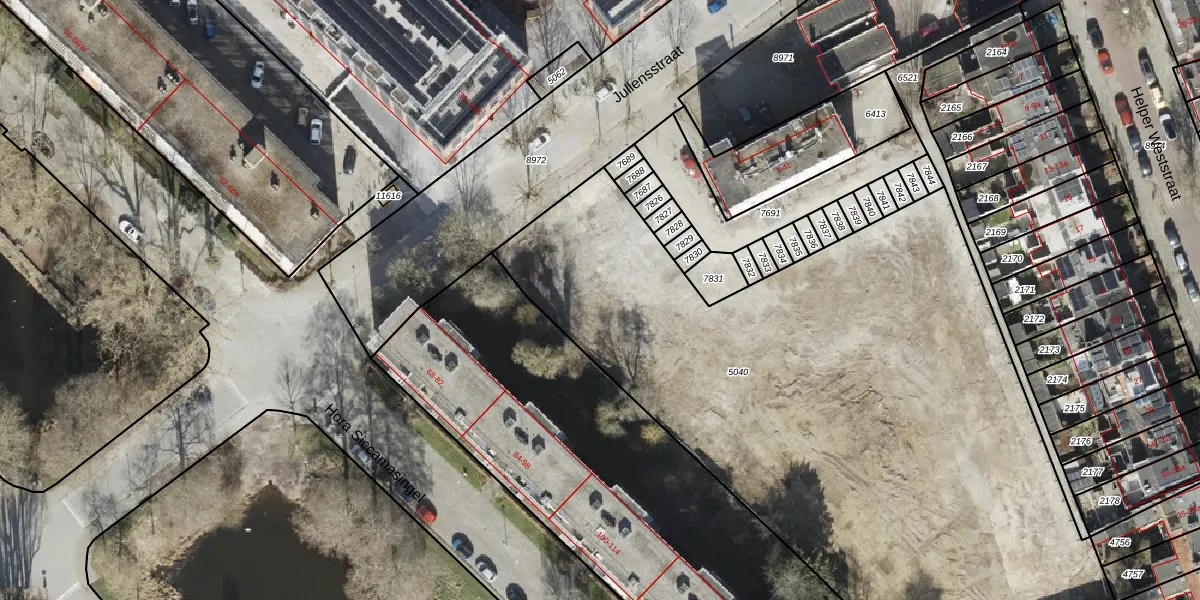 Jullensstraat 2-16 is gelegen op kadastraal perceel HMN02M5040. Deze kadastrale aanduiding is uniek en wordt gebruikt door het Kadaster om eigendomsrechten en andere zakelijke rechten vast te leggen. Het perceel maakt onderdeel uit van de kadastrale gemeente Helpman.