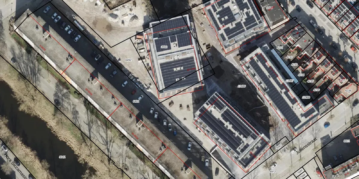 Het perceel waarop Jullensstraat 227 staat heeft een oppervlakte van 817 m². Dit is een groot perceel. De perceeloppervlakte wordt geregistreerd door het Kadaster. Gedetailleerde informatie over de maten van dit perceel kunt u vinden in het rapport Kadastrale kaart met maatvoering van Jullensstraat 227.