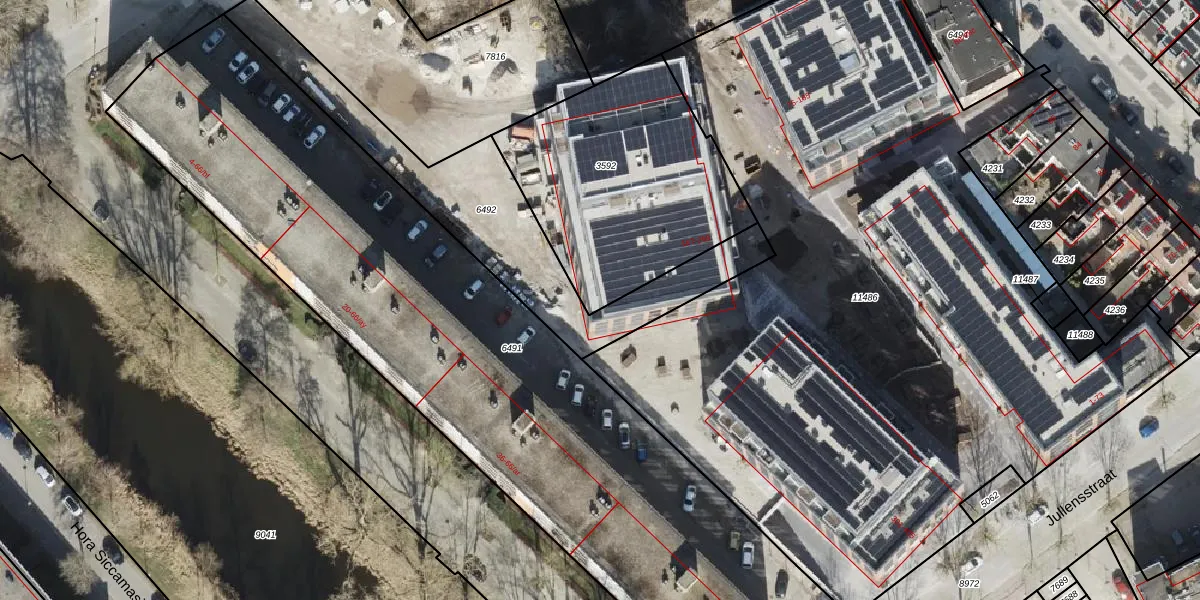 Het perceel waarop Jullensstraat 289 staat heeft een oppervlakte van 1060 m². Dit is een zeer groot perceel. De perceeloppervlakte wordt geregistreerd door het Kadaster. Gedetailleerde informatie over de maten van dit perceel kunt u vinden in het rapport Kadastrale kaart met maatvoering van Jullensstraat 289.