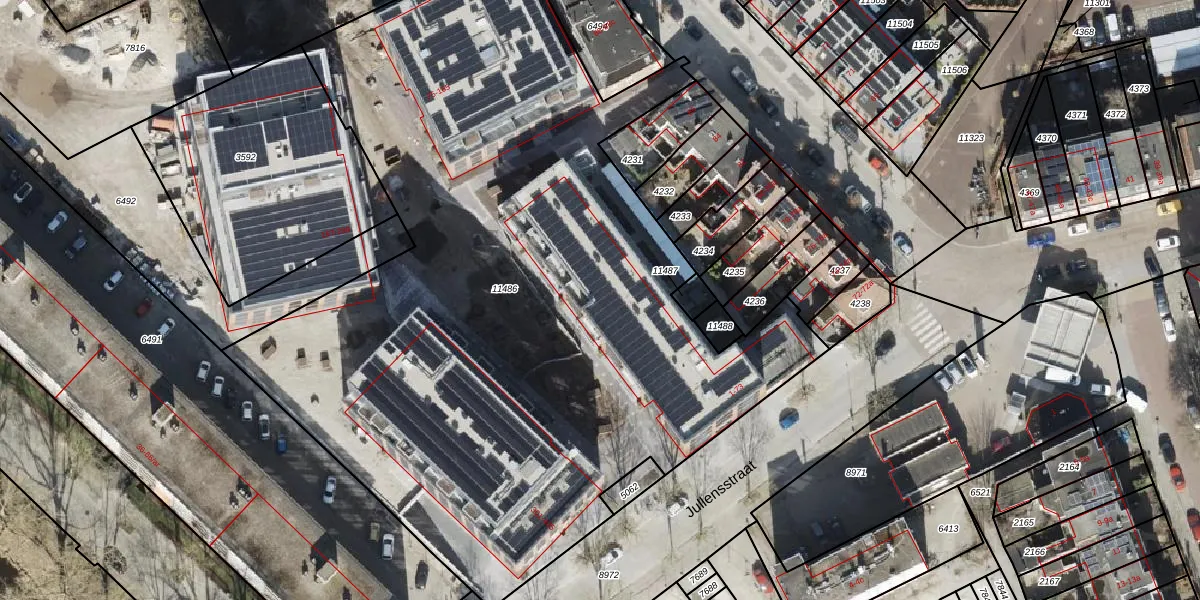 Het perceel waarop Jullensstraat 29 staat heeft een oppervlakte van 5241 m². Dit is een zeer groot perceel. De perceeloppervlakte wordt geregistreerd door het Kadaster. Gedetailleerde informatie over de maten van dit perceel kunt u vinden in het rapport Kadastrale kaart met maatvoering van Jullensstraat 29.