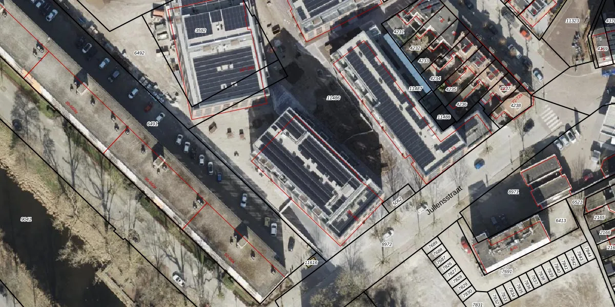 Het perceel waarop Jullensstraat 335 staat heeft een oppervlakte van 5241 m². Dit is een zeer groot perceel. De perceeloppervlakte wordt geregistreerd door het Kadaster. Gedetailleerde informatie over de maten van dit perceel kunt u vinden in het rapport Kadastrale kaart met maatvoering van Jullensstraat 335.