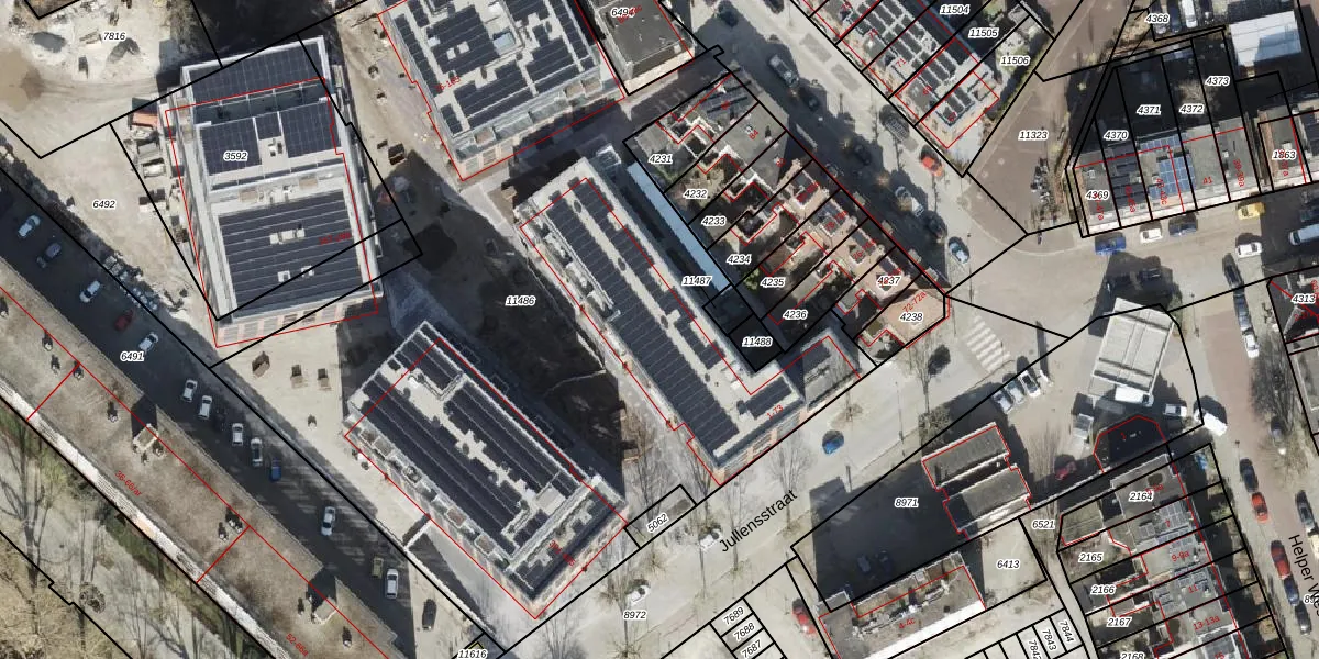 Het perceel waarop Jullensstraat 45 staat heeft een oppervlakte van 5241 m². Dit is een zeer groot perceel. De perceeloppervlakte wordt geregistreerd door het Kadaster. Gedetailleerde informatie over de maten van dit perceel kunt u vinden in het rapport Kadastrale kaart met maatvoering van Jullensstraat 45.