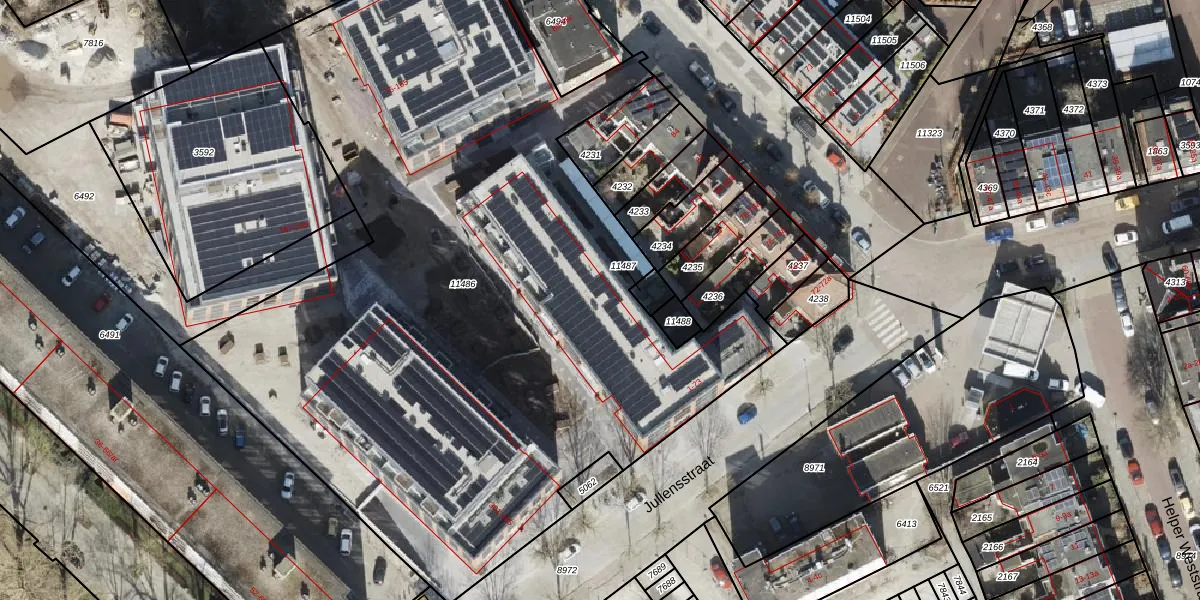 Het perceel waarop Jullensstraat 63 staat heeft een oppervlakte van 5241 m². Dit is een zeer groot perceel. De perceeloppervlakte wordt geregistreerd door het Kadaster. Gedetailleerde informatie over de maten van dit perceel kunt u vinden in het rapport Kadastrale kaart met maatvoering van Jullensstraat 63.