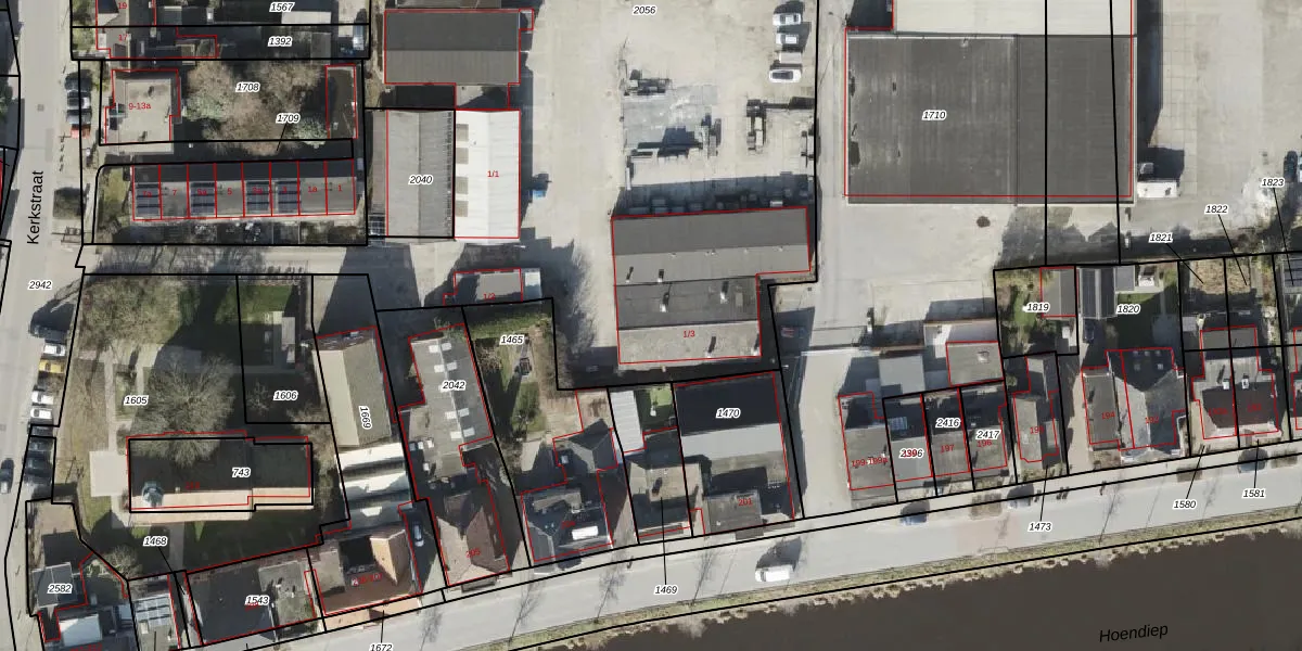 Kerkstraat 1-3 is gelegen op kadastraal perceel HKK02B2056. Deze kadastrale aanduiding is uniek en wordt gebruikt door het Kadaster om eigendomsrechten en andere zakelijke rechten vast te leggen. Het perceel maakt onderdeel uit van de kadastrale gemeente Hoogkerk.