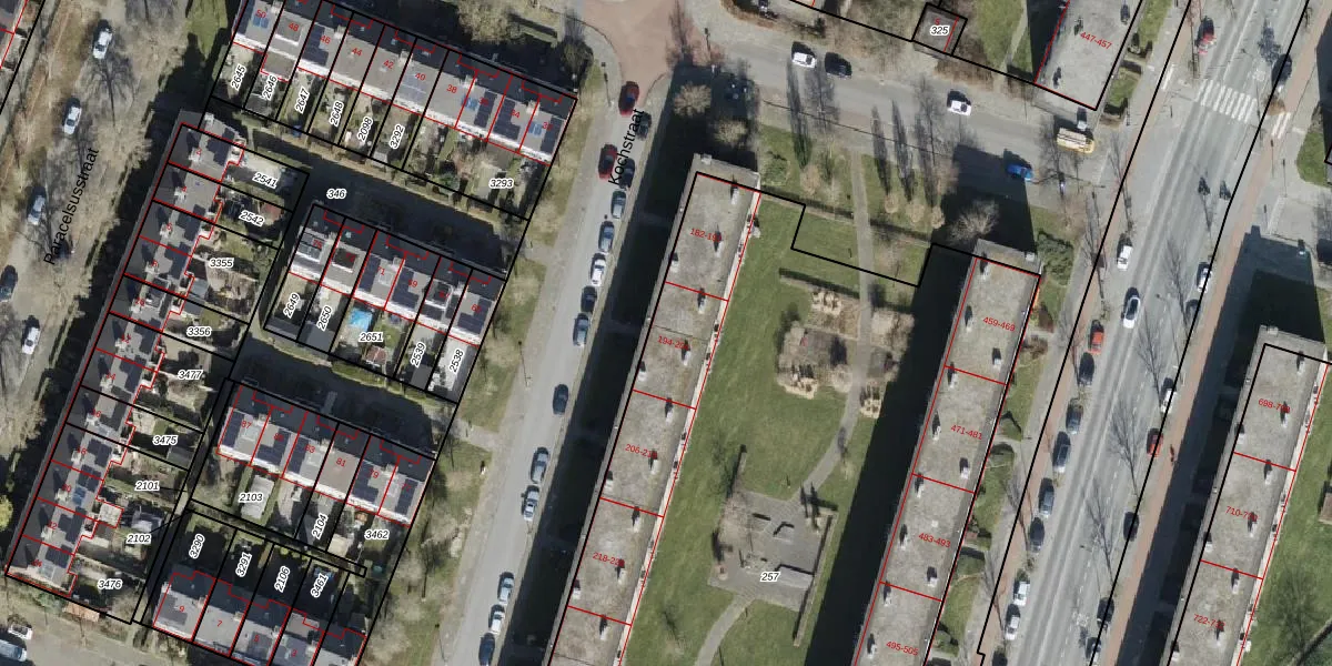 Het perceel waarop Kochstraat 196 staat heeft een oppervlakte van 5301 m². Dit is een zeer groot perceel. De perceeloppervlakte wordt geregistreerd door het Kadaster. Gedetailleerde informatie over de maten van dit perceel kunt u vinden in het rapport Kadastrale kaart met maatvoering van Kochstraat 196.