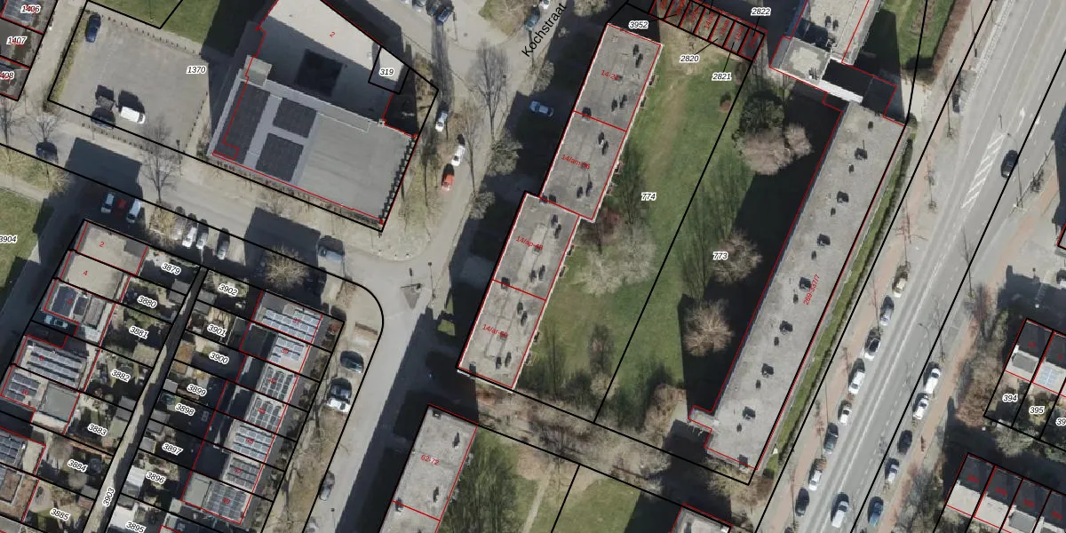 Het perceel waarop Kochstraat 48 staat heeft een oppervlakte van 2070 m². Dit is een zeer groot perceel. De perceeloppervlakte wordt geregistreerd door het Kadaster. Gedetailleerde informatie over de maten van dit perceel kunt u vinden in het rapport Kadastrale kaart met maatvoering van Kochstraat 48.