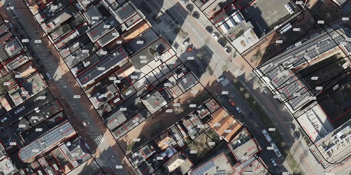 Het perceel waarop Korenstraat 6-b staat heeft een oppervlakte van 96 m². Dit is een klein perceel. De perceeloppervlakte wordt geregistreerd door het Kadaster. Gedetailleerde informatie over de maten van dit perceel kunt u vinden in het rapport Kadastrale kaart met maatvoering van Korenstraat 6-b.