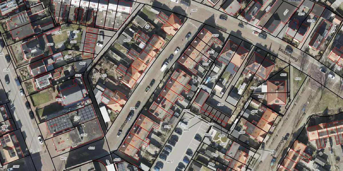 Het perceel waarop Kotterstraat 12 staat heeft een oppervlakte van 1495 m². Dit is een zeer groot perceel. De perceeloppervlakte wordt geregistreerd door het Kadaster. Gedetailleerde informatie over de maten van dit perceel kunt u vinden in het rapport Kadastrale kaart met maatvoering van Kotterstraat 12.