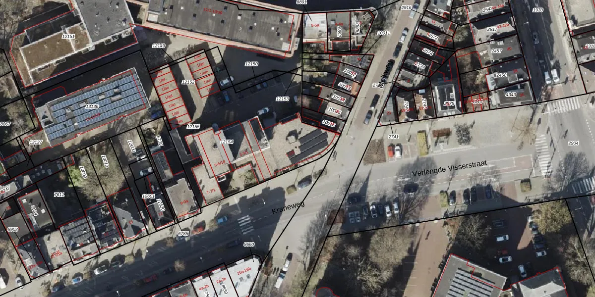 Kraneweg 1-3 is gelegen op kadastraal perceel GNG00C12154. Deze kadastrale aanduiding is uniek en wordt gebruikt door het Kadaster om eigendomsrechten en andere zakelijke rechten vast te leggen. Het perceel maakt onderdeel uit van de kadastrale gemeente Groningen.