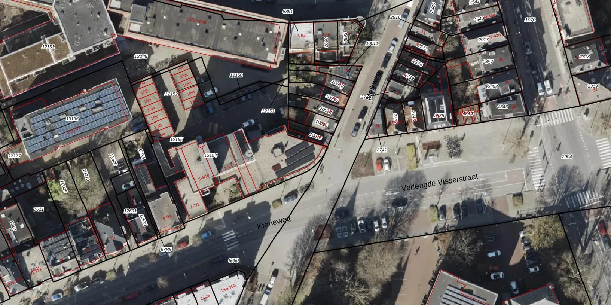 Kraneweg 1-5 is gelegen op kadastraal perceel GNG00C12154. Deze kadastrale aanduiding is uniek en wordt gebruikt door het Kadaster om eigendomsrechten en andere zakelijke rechten vast te leggen. Het perceel maakt onderdeel uit van de kadastrale gemeente Groningen.