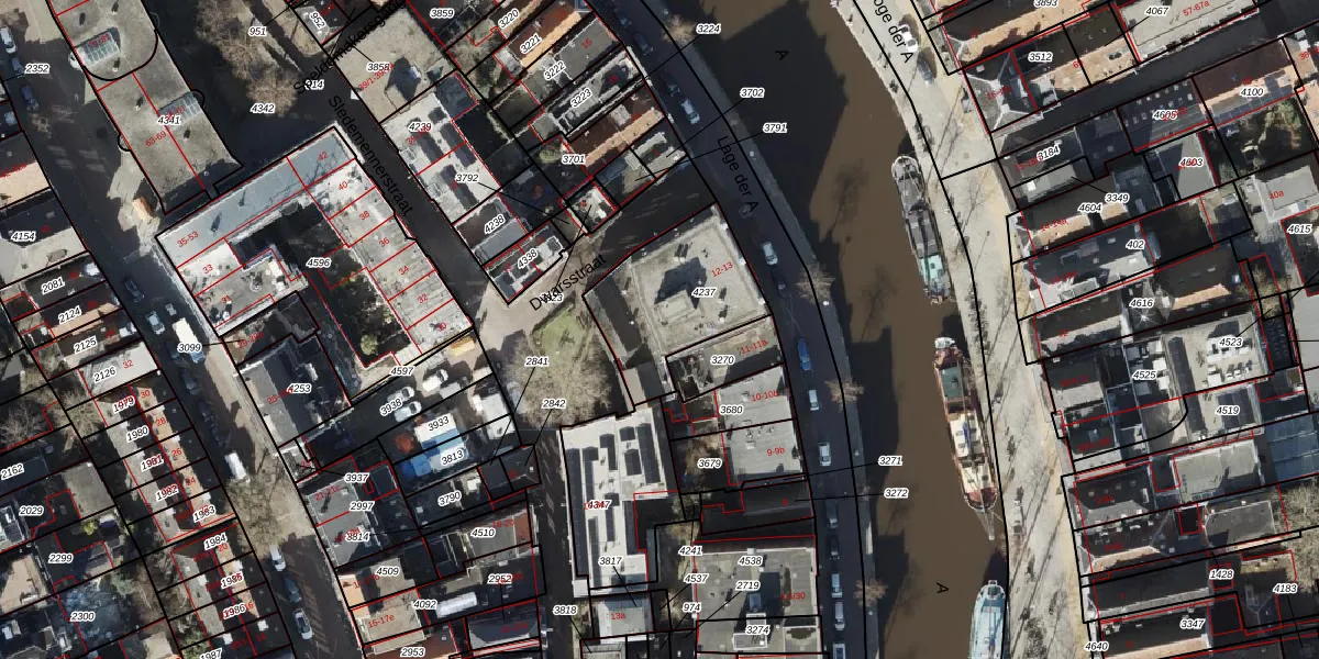 Het adres is gelegen op perceel 4237 in de sectie K en de kadastrale gemeente Groningen. De kadastrale aanduiding is aldus GNG00-K-4237. Het perceel is 444 m² groot. Dat is kleiner dan de gemiddelde perceeloppervlakte in Groningen, dat op 770,65 m² ligt. Het kleinste perceel in de kadastrale gemeente is 0 m² groot. De grootste perceeloppervlakte is 31,8 ha. Op het perceel zijn 40 adressen aanwezig. De huidige grenzen van het perceel zijn digitaal in de Basisregistratie Kadaster (BRK) geregistreerd op 20-06-2003.