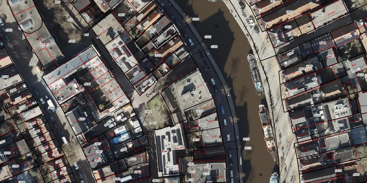 Het adres is gelegen op perceel 4237 in de sectie K en de kadastrale gemeente Groningen. De kadastrale aanduiding is aldus GNG00-K-4237. Het perceel is 444 m² groot. Dat is kleiner dan de gemiddelde perceeloppervlakte in Groningen, dat op 770,67 m² ligt. Het kleinste perceel in de kadastrale gemeente is 0 m² groot. De grootste perceeloppervlakte is 31,8 ha. Op het perceel zijn 40 adressen aanwezig. In de Basisregistratie Kadaster (BRK) werden de grenzen van het perceel geregistreerd op 20-06-2003.