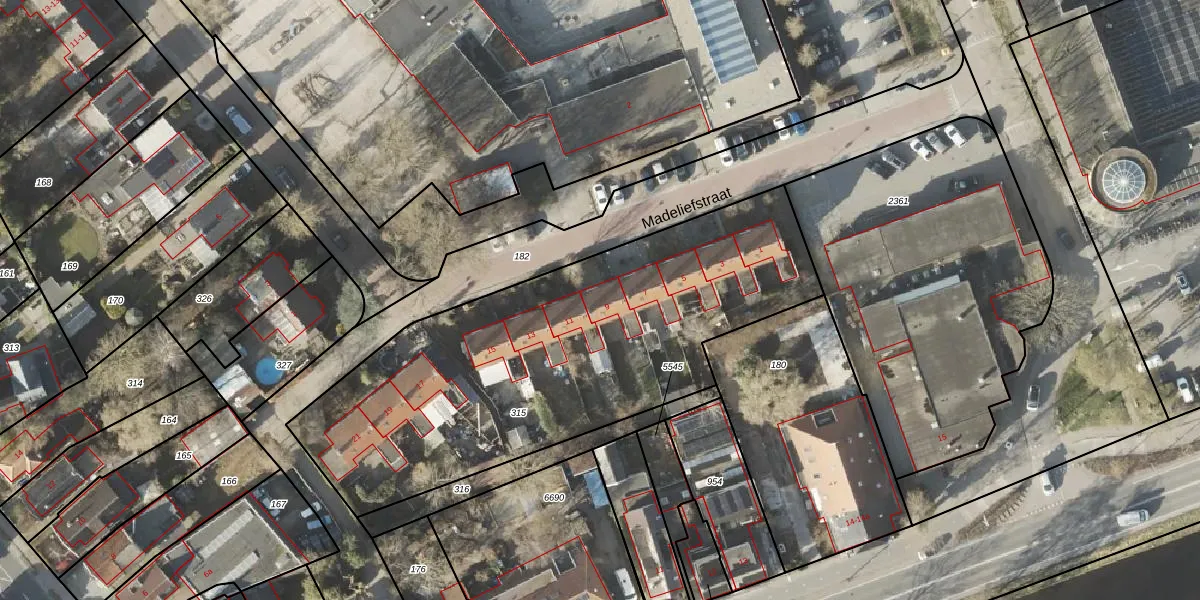 Het perceel waarop Madeliefstraat 9 staat heeft een oppervlakte van 2165 m². Dit is een zeer groot perceel. De perceeloppervlakte wordt geregistreerd door het Kadaster. Gedetailleerde informatie over de maten van dit perceel kunt u vinden in het rapport Kadastrale kaart met maatvoering van Madeliefstraat 9.