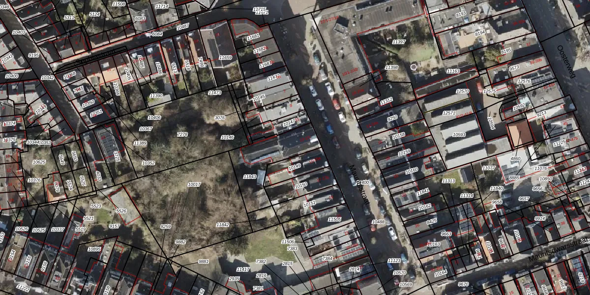 Het perceel waarop Mauritsstraat 13-c staat heeft een oppervlakte van 385 m². Dit is een groot perceel. De perceeloppervlakte wordt geregistreerd door het Kadaster. Gedetailleerde informatie over de maten van dit perceel kunt u vinden in het rapport Kadastrale kaart met maatvoering van Mauritsstraat 13-c.