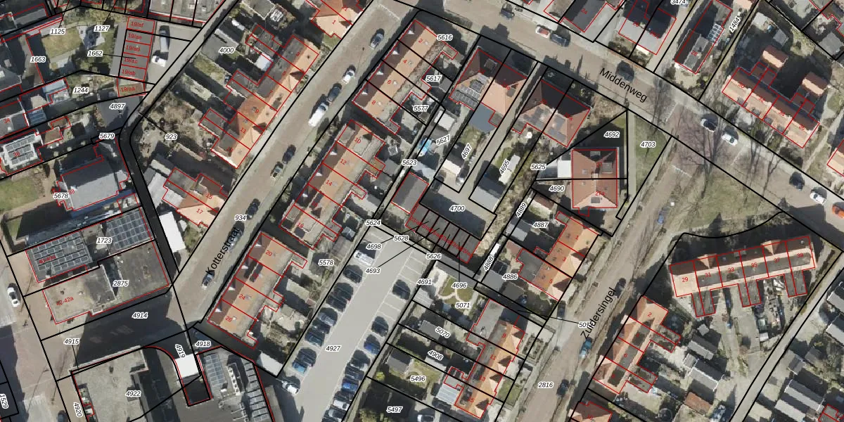 Middenweg 23-af is gelegen op kadastraal perceel HKK02C5627. Deze kadastrale aanduiding is uniek en wordt gebruikt door het Kadaster om eigendomsrechten en andere zakelijke rechten vast te leggen. Het perceel maakt onderdeel uit van de kadastrale gemeente Hoogkerk.
