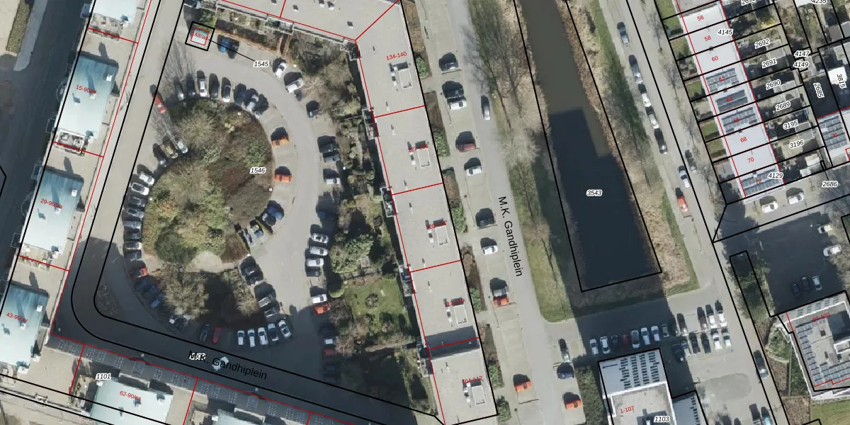 Het perceel waarop M.K. Gandhiplein 124 staat heeft een oppervlakte van 6841 m². Dit is een zeer groot perceel. De perceeloppervlakte wordt geregistreerd door het Kadaster. Gedetailleerde informatie over de maten van dit perceel kunt u vinden in het rapport Kadastrale kaart met maatvoering van M.K. Gandhiplein 124.