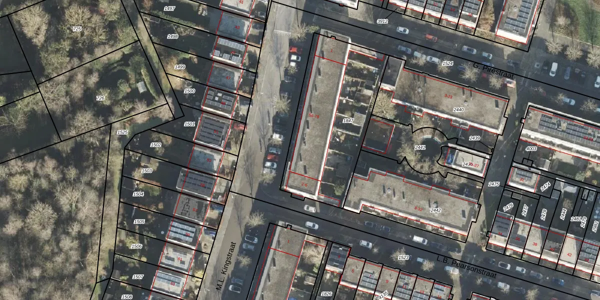 Het perceel waarop M.L. Kingstraat 64 staat heeft een oppervlakte van 1289 m². Dit is een zeer groot perceel. De perceeloppervlakte wordt geregistreerd door het Kadaster. Gedetailleerde informatie over de maten van dit perceel kunt u vinden in het rapport Kadastrale kaart met maatvoering van M.L. Kingstraat 64.
