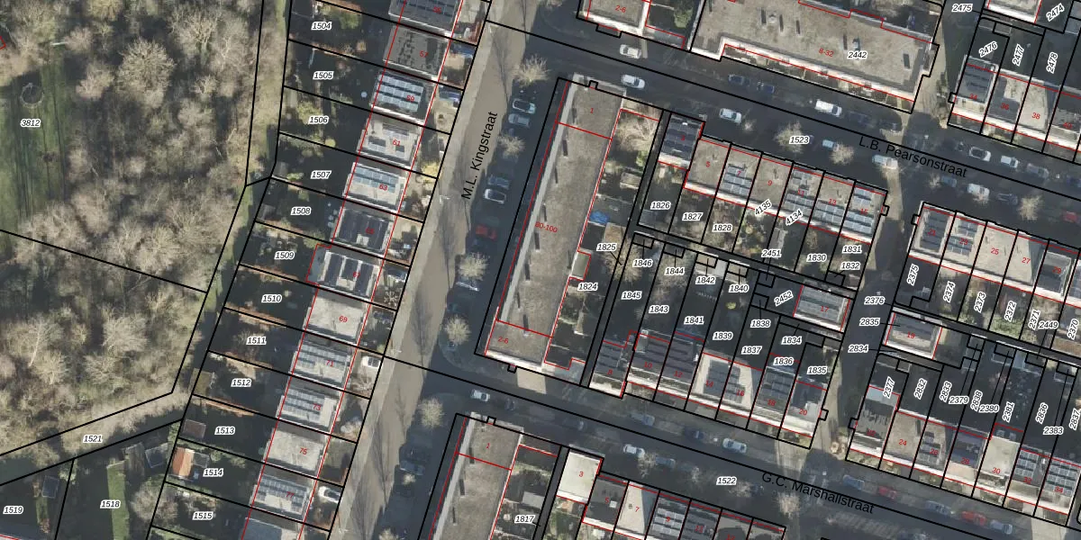 Het perceel waarop M.L. Kingstraat 94 staat heeft een oppervlakte van 1085 m². Dit is een zeer groot perceel. De perceeloppervlakte wordt geregistreerd door het Kadaster. Gedetailleerde informatie over de maten van dit perceel kunt u vinden in het rapport Kadastrale kaart met maatvoering van M.L. Kingstraat 94.