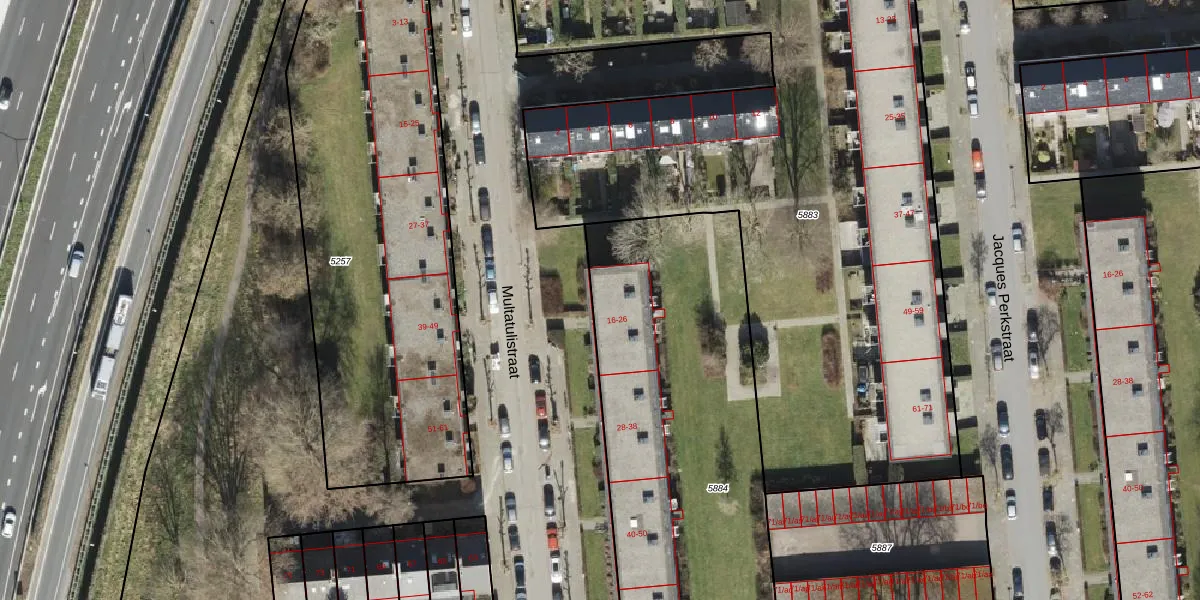 Het perceel waarop Multatulistraat 16 staat heeft een oppervlakte van 2446 m². Dit is een zeer groot perceel. De perceeloppervlakte wordt geregistreerd door het Kadaster. Gedetailleerde informatie over de maten van dit perceel kunt u vinden in het rapport Kadastrale kaart met maatvoering van Multatulistraat 16.