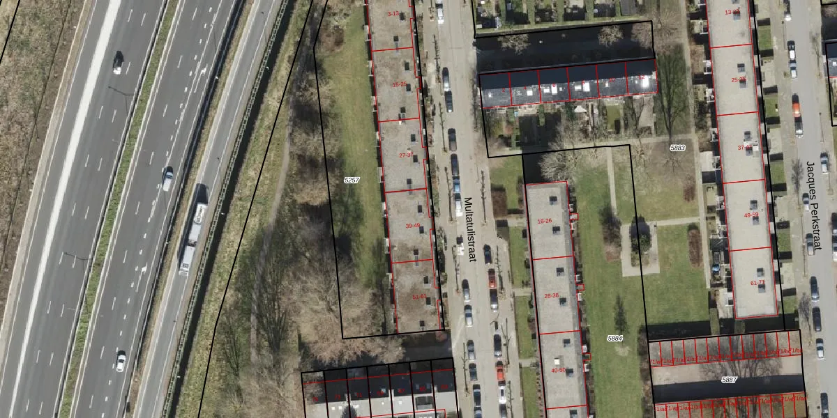 Het perceel waarop Multatulistraat 39 staat heeft een oppervlakte van 2073 m². Dit is een zeer groot perceel. De perceeloppervlakte wordt geregistreerd door het Kadaster. Gedetailleerde informatie over de maten van dit perceel kunt u vinden in het rapport Kadastrale kaart met maatvoering van Multatulistraat 39.