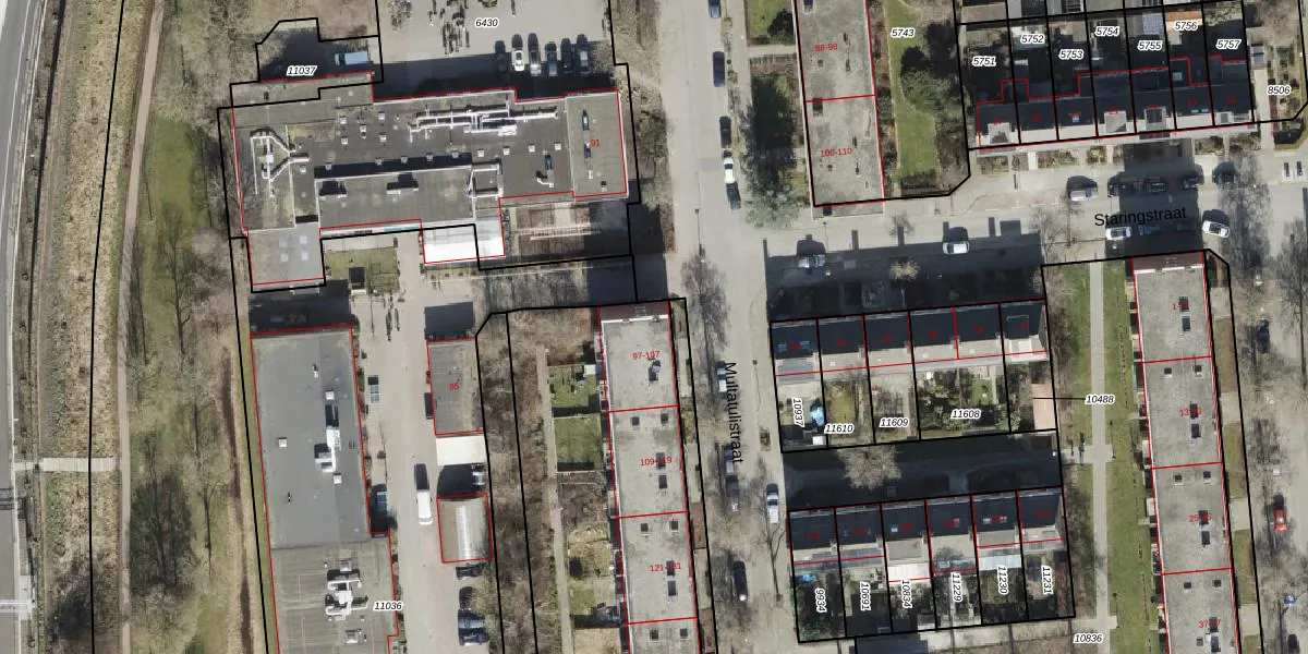Het perceel waarop Multatulistraat 97 staat heeft een oppervlakte van 2524 m². Dit is een zeer groot perceel. De perceeloppervlakte wordt geregistreerd door het Kadaster. Gedetailleerde informatie over de maten van dit perceel kunt u vinden in het rapport Kadastrale kaart met maatvoering van Multatulistraat 97.