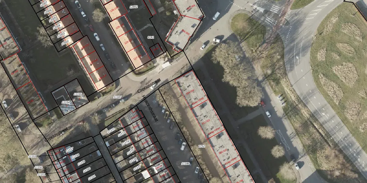 Het perceel waarop Narcisstraat 10-az staat heeft een oppervlakte van 1638 m². Dit is een zeer groot perceel. De perceeloppervlakte wordt geregistreerd door het Kadaster. Gedetailleerde informatie over de maten van dit perceel kunt u vinden in het rapport Kadastrale kaart met maatvoering van Narcisstraat 10-az.